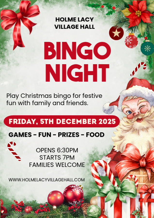 Join us at Holme Lacy Village Hall on Friday 5th December for a fun-filled Family Bingo Night.