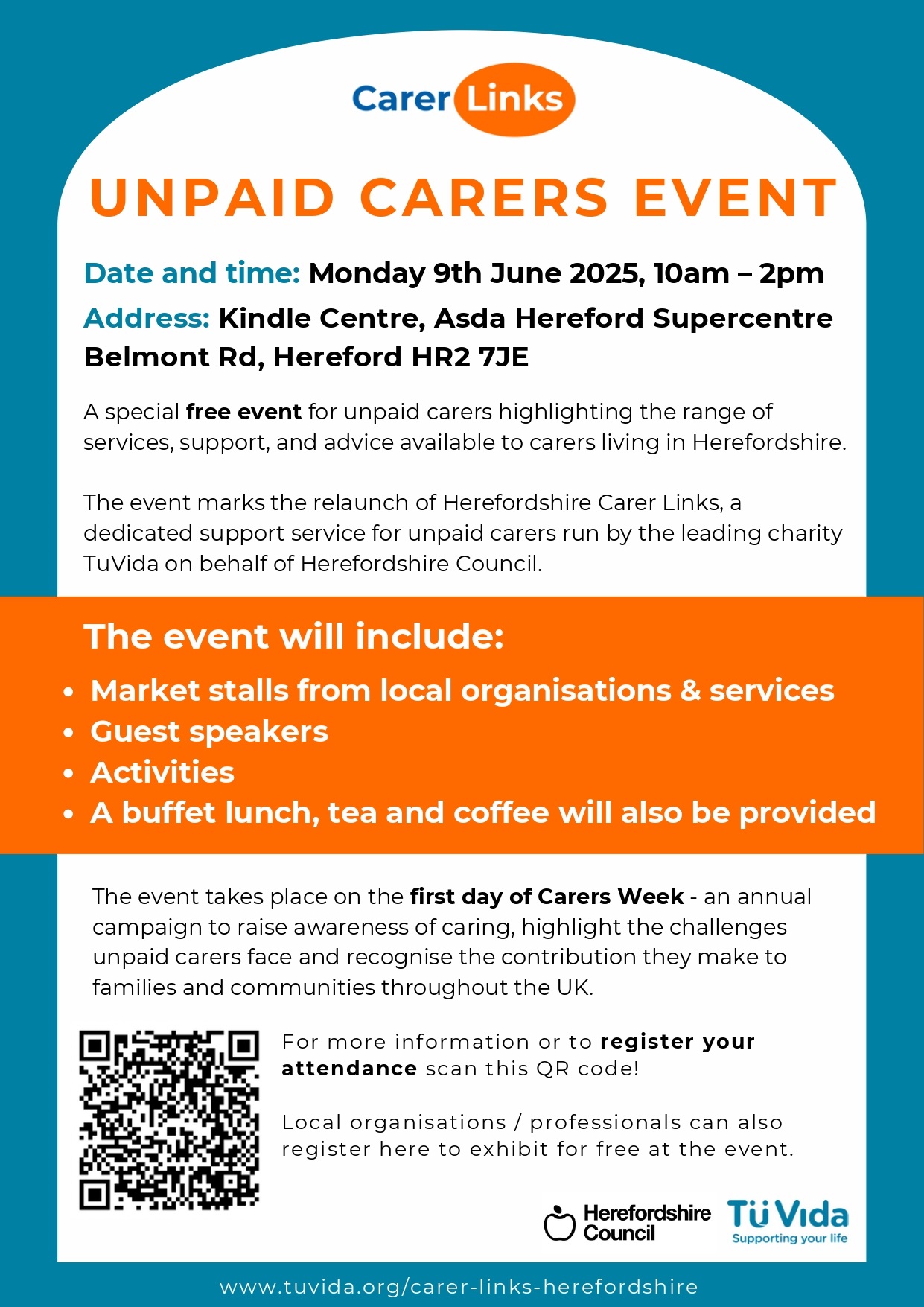 This event marks the relaunch of Herefordshire Carer Links, a dedicated support service for unpaid carers run by the leading charity TuVida on behalf of Herefordshire Council.