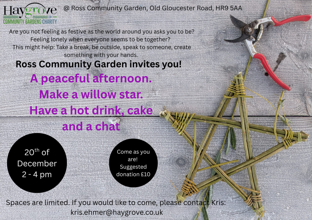 This might help: take a break, be outside, speak to someone, create something with your hands. Ross Community Garden invites you to have a peaceful afternoon making a Willow Star, enjoying a hot drink and a chat.