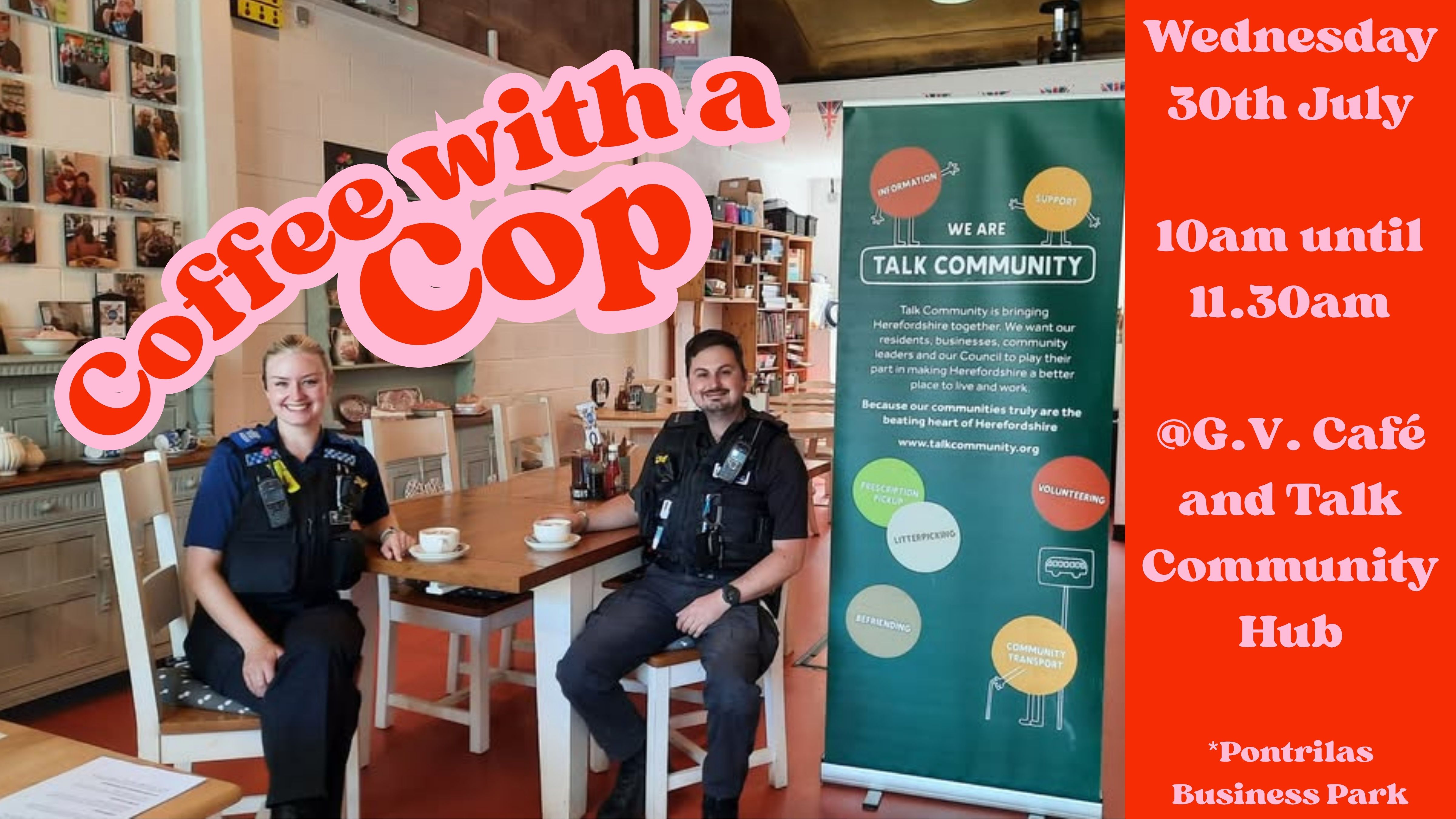 We are proudly partnering with West Mercia Police to host 'Coffee with a Cop' in G.V. Café and Talk Community Hub! Come and meet the Safer Neighbourhood Team, PC Tally Hunt and PC Jack Davies during the Summer holidays.