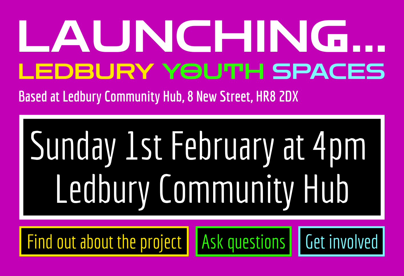 Ledbury Youth Spaces will be hosting a launch event on Sunday 1st February at 4pm at Ledbury Community Hub, 8 New Street, HR8 2DX. You will have the opportunity to find out about the project, ask questions and get involved.